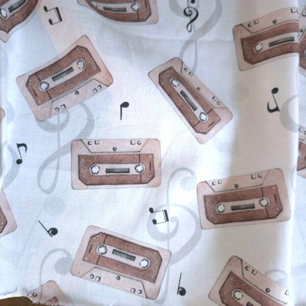Ce tissu en coton imprimé, avec son fond blanc orné de dessins de cassettes et de clés de musique, évoque des souvenirs nostalgiques de mélodies passées. Un clin d’œil à l’univers musical, il serait parfait pour réaliser des pièces uniques comme des sacs à dos pour les passionnés de musique, ou encore des rideaux amusants pour une chambre dédiée à la créativité.